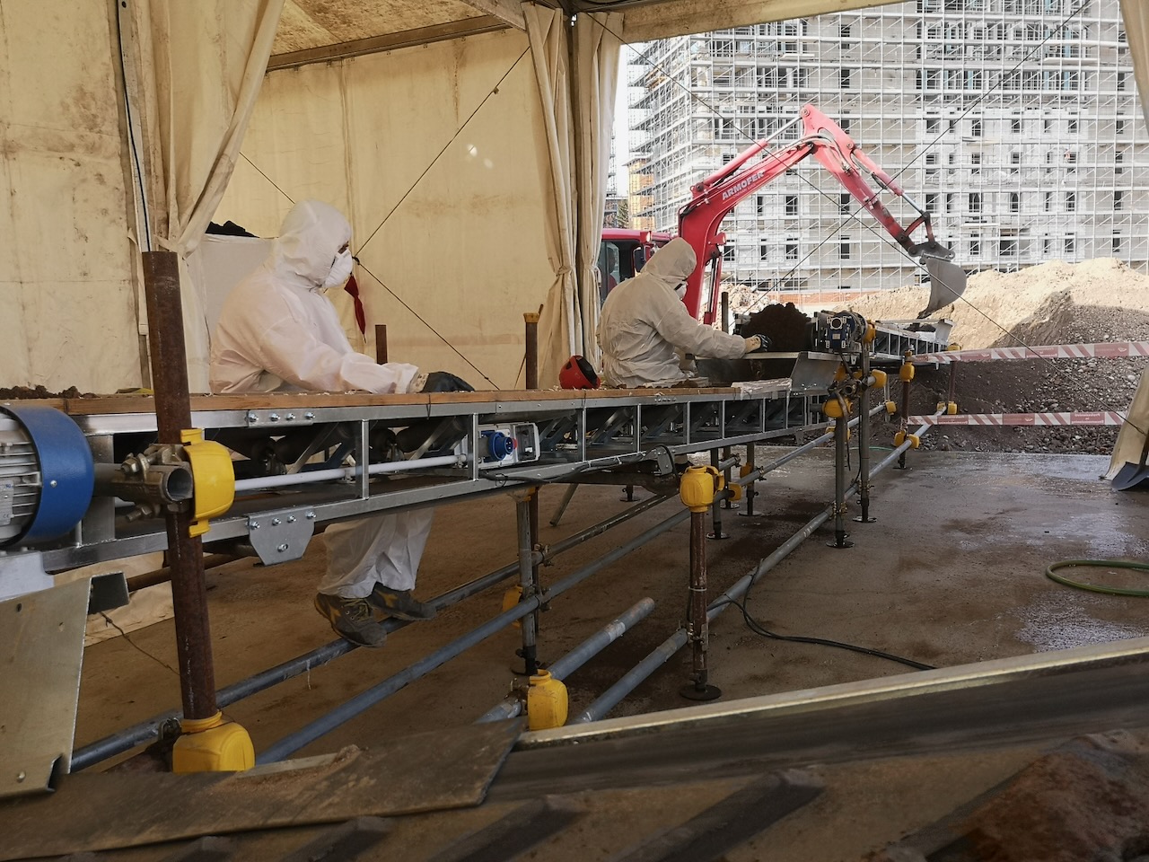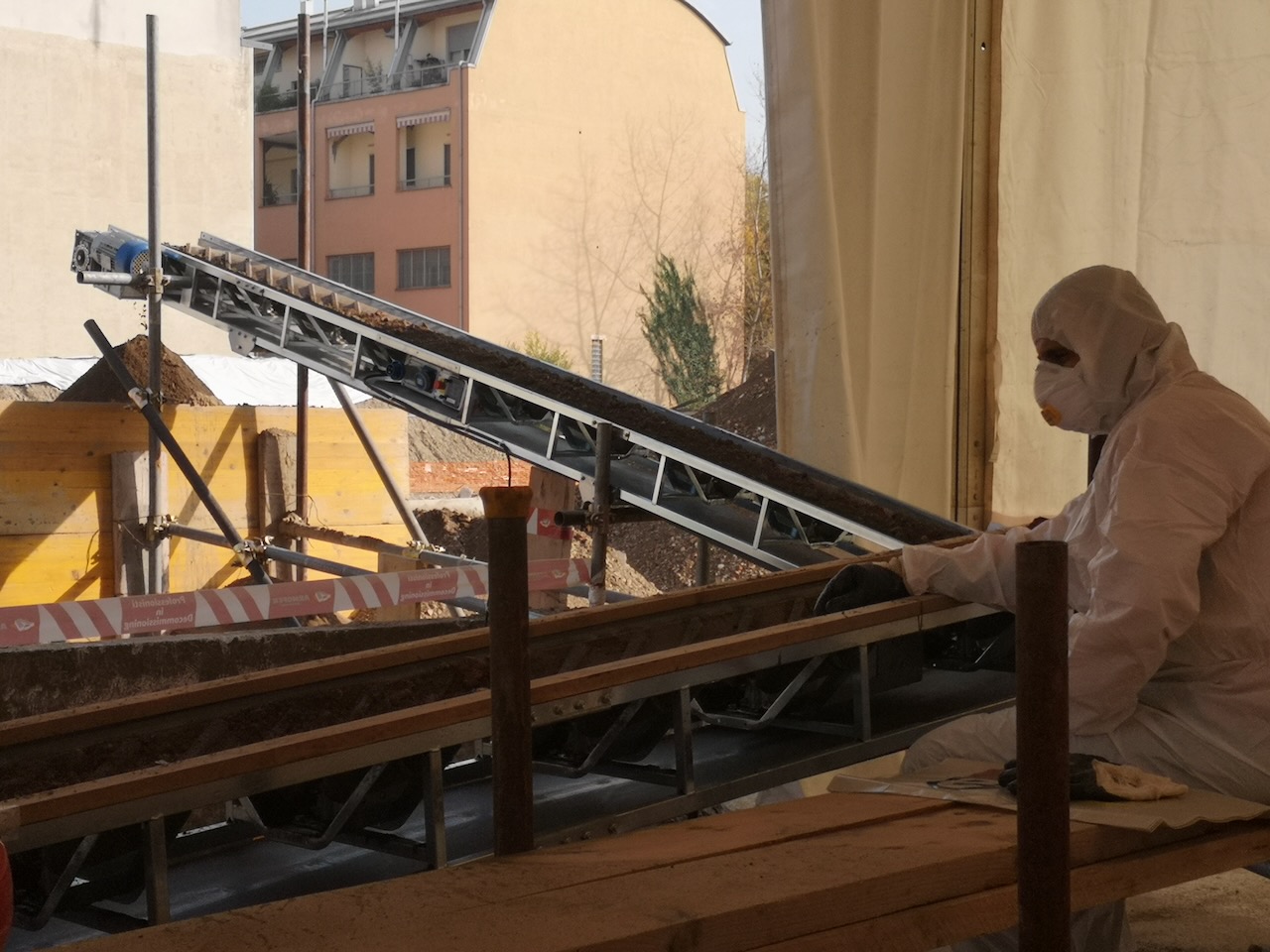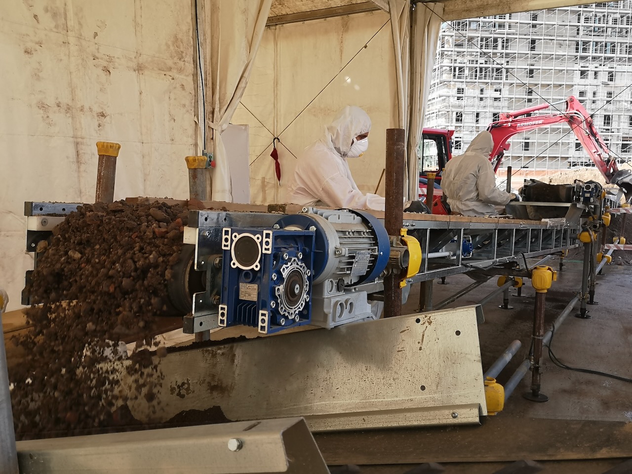 L’intervento che ha caratterizzato il sito è la bonifica ambientale del terreno, risultato non compatibile con le nuove destinazioni d’uso previste a causa della presenza di frammenti di MCA in banco. La campagna di bonifica concordata con gli Enti preposti al controllo ha visto in campo una strategia innovativa a tutela dell’ambiente e riducendo al minimo le attività manuali. In cantiere è stata allestita un’ampia area a confinamento statico servita da nastri trasportatori per rendere più leggere e accessibili in posizione ergonomica, le attività manuali di cernita, dato l’ingente quantitativo di terre da trattare.